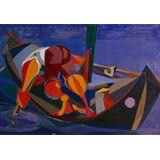 Gli anni della prigionia, lunghi, interminabili, consegnano taccuini di disegni d’altissima qualità, d’ingegno scattante, mai domato dal contesto inumano e sofferto. Queste prove grafiche lo condurranno a dipingere nuovamente e con un nuovo spirito proprio al nascere del secondo dopoguerra, partecipando tra l’altro alla 35ma Collettiva della Bevilacqua La Masa del 47 con l’opera Figura la quale inizia ed apre la ricerca dell’autore e ne connota la prima cifra personale. Giunge qui la sintesi delle passioni passate, dell’ amore per le cromie e delle linee amare del Gino Rossi maturo, transitate con ottimo esito nella ricerca neocubista cui questo ritratto non soggiace alzandosi plasticamente nella sua scomposizione grazie ad un sapiente orchestrarsi dei toni cupi e terrestri spinti, accesi e focalizzanti dell’incarnato che sottilmente si spinge sino al contrappunto dei rossi concepiti come una rottura antinaturalistica.