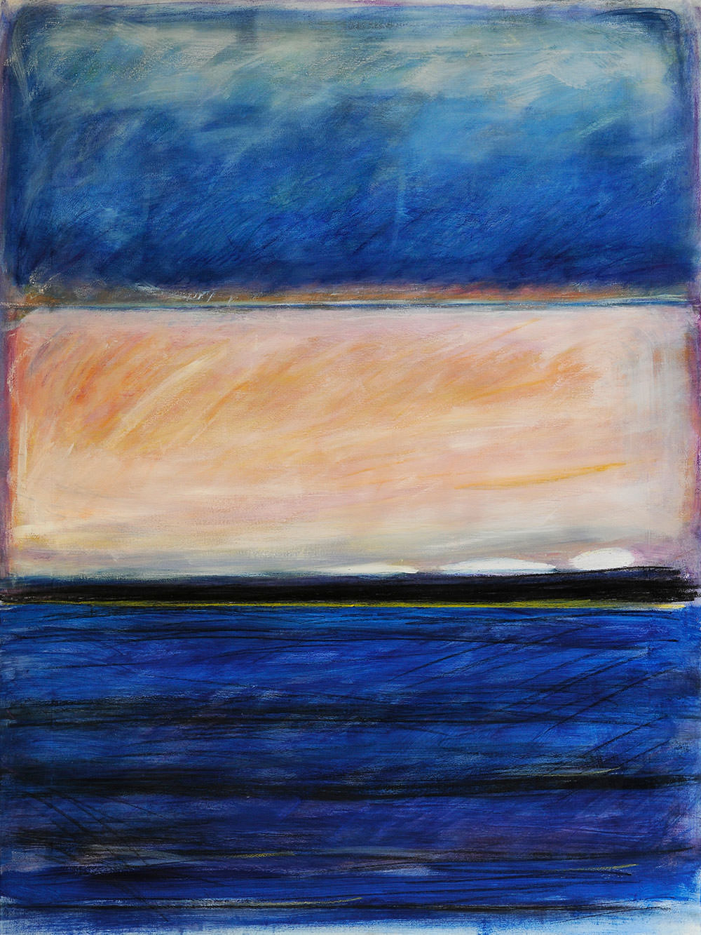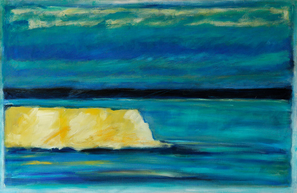 Due opere sono particolarmente interessanti per ciò che mostrano della ricerca attuale : NOTTE DI GHIACCIO 1 : ad un certo punto un grande segno si impone con immensa violenza. Questo segno , intenso , rapido , folgorante appare su di una superficie già elaborata , attraverso una sorta di strofinamento e di attrito , rivela la profondità sotto-giacente e domina in maniera tale che l’intero tessuto della tela assume un significato completamente diverso. E’ l’avvio per un nuova ricerca che privilegia la traccia e la scrittura. In VISIONE 2: al contrario , e ciò lo dimostra bene la riflessione sull’opera attraverso la pratica ,il mestiere del pittore , Marina quasi contemporaneamente, annulla ogni segno , mettendo in evidenza in modo essenziale piani di colore/luce che si aprono offrendosi alla contemplazione. Il campo di indagine è estremamente aperto, ma segno o no , la tela è sempre l’espressione di questo PAESAGGIO INTERIORE nato dallo sguardo di Marina sulle forze della natura e , come lei stessa dice cosi’ bene : “col desiderio di comunicare la gioia di un’emozione.