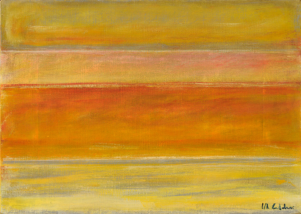 Io mi trovo di fronte ad uno dei quadri di Marina Caldari e ciò che raggiunge il mio sguardo è, innanzitutto, il colore in cui mi immergo. Poi percepisco il rapporto tra due colori dominanti che danno origine agli spazi,