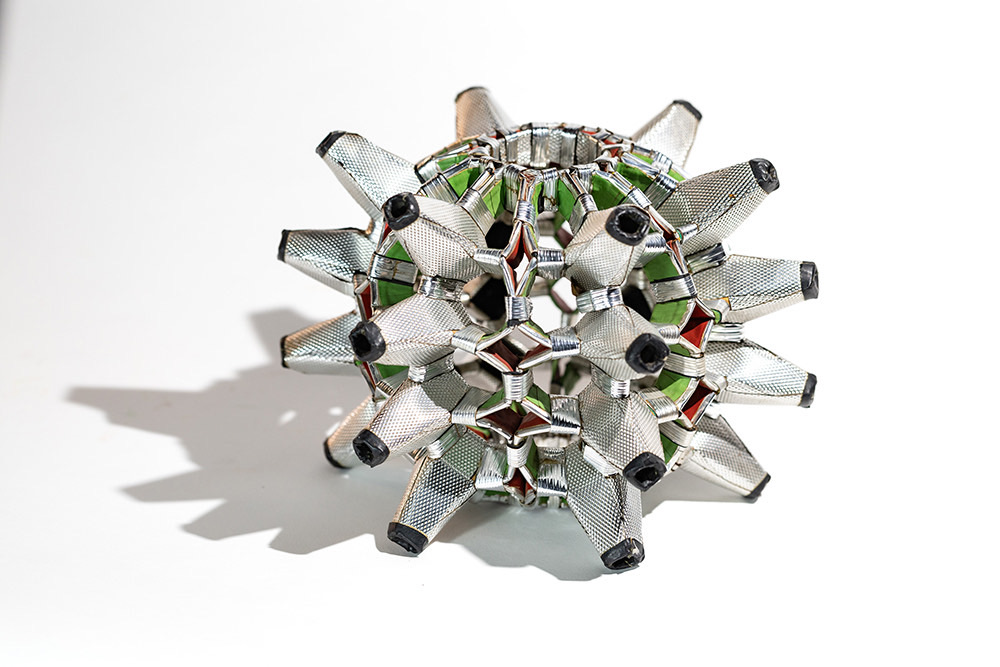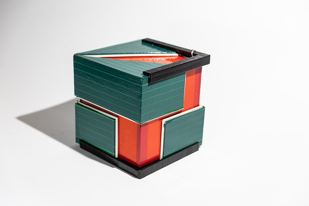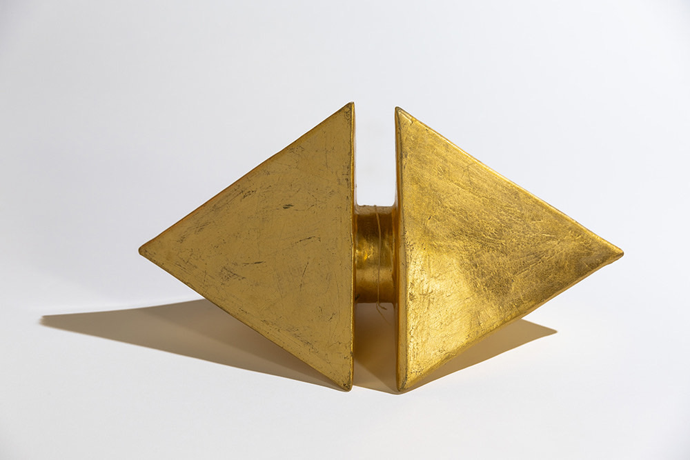 Con il termine pupazzi l’artista si riferisce a figure zoomorfe e antropomorfe, alle quali vanno aggiunte opere geometriche. È un originale bestiario - termine con cui si indicavano i trattati medievali sugli animali - quello proposto da Guaccero, un bestiario novecentesco che possiamo definire fantastico e metamorfico composto da insetti dai grandi occhi che ci scrutano e da ingegnosi uccelli che si muovono dinoccolati o che becchettano con colpi frequenti e precisi. Accanto a questi ci sono imprevedibili personaggi, figure bizzarre, vivaci e dispettosi diavoletti, figure grassocce, dall'aspetto gioviale, bonari e attenti guerrieri. Le figure sono semplificate, geometrizzate e si presentano come sagome che vanno osservate di profilo o di fronte, sono in stato di quiete ma le loro ruote, articolazioni e snodi ci permettono di immaginare queste creature mentre si muovono meccanicamente nel mondo vivace e colorato evocato dall’artista. Non diversamente le opere geometriche, composte soprattutto da cerchi e triangoli, si aprono a ventaglio o si presentano con elementi sovrapposti o sovrapponibili, e ci invitano a giocare con le forme inventandone di nuove. Come ricorda la figlia Anna Maria, “il suo studio era pieno di carte colorate e di materiali di riciclo che lei usava; rotoli di carta da cucina, di carta igienica, dei fax, non buttava mai la carta, tutto veniva riciclato e trasformato in qualcosa di diverso che scaturiva dalla sua fantasia”. I materiali di riciclo, grazie all’azione creativa dell’artista, diventano complessi plastici: cubi multicolori, sfere argentate con protuberanze piramidali che fuoriescono creando un effetto caleidoscopico, assembramenti di forme cilindriche, realizzate con cartone e nastro adesivo, da cui riaffiora uno spirito architettonico.