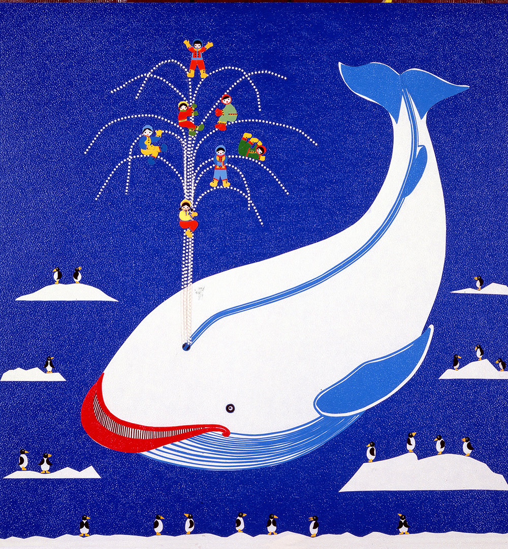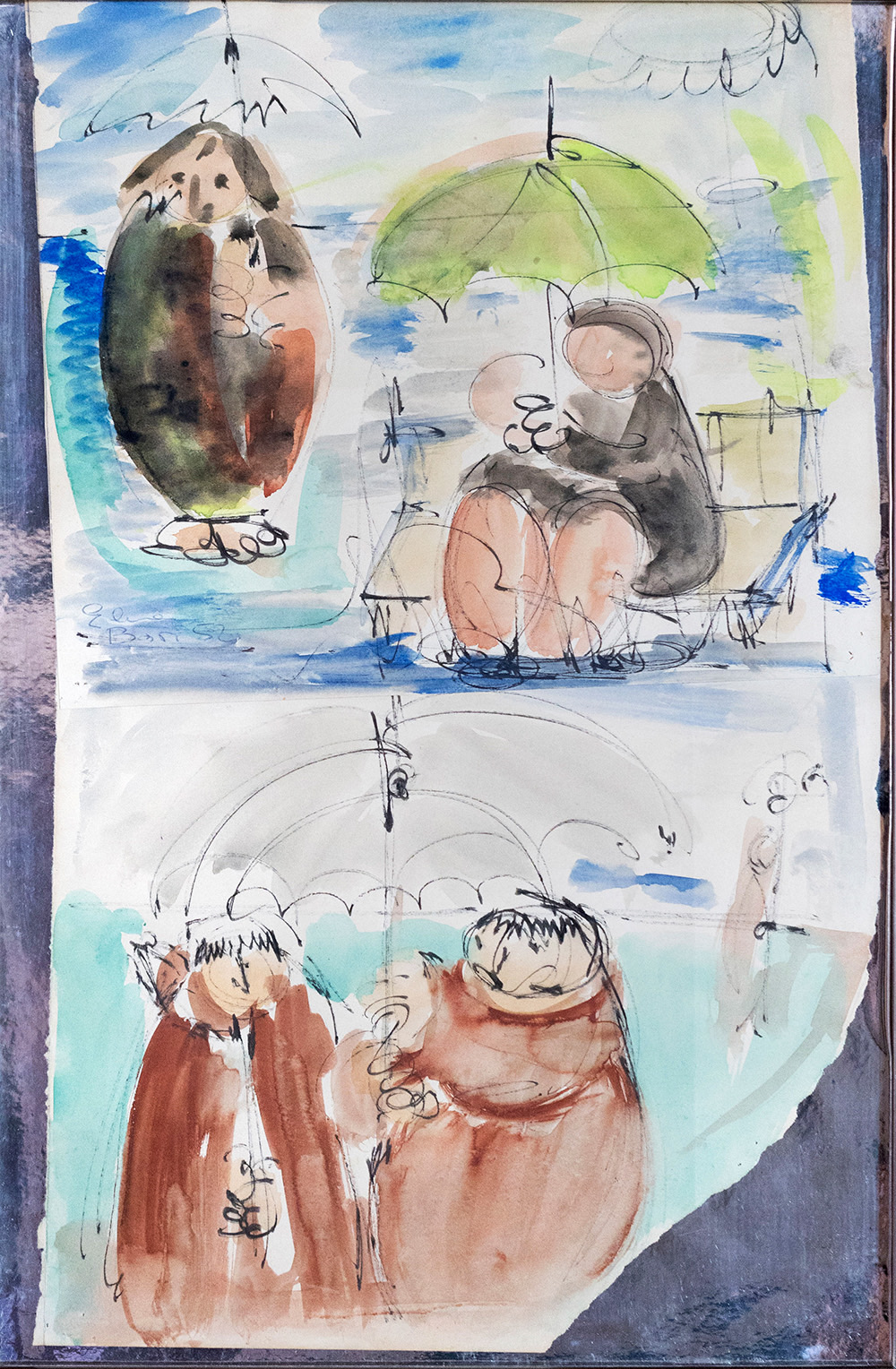 Non mancano in mostra collages creati con grande precisione. Attraverso l’ingegno e la sua maestria artistica, Guaccero compone queste opere utilizzando elementi già strutturati (trasferelli e trasferibili) e carte adesive meticolosamente ritagliate con taglierini e forbici. Alcuni si rivelano come veri e propri racconti, si veda la gigantesca balena bianca sul cui soffio si arrampicano piccoli bambini eschimesi mentre tutt’intorno sugli iceberg vediamo numerosi pinguini, o il futuristico robot inviato nello spazio, altri offrono una visione ludica dello studio della geometria come la coloratissima dimostrazione del Teorema di Pitagora. Viene presentata infine l’attività pittorica di Guaccero che si muove tra forme astratte biomorfe, caratterizzate da nette e compatte campiture ottenute ritagliando cartoncini colorati poi sovrapposti, e una ricerca figurativa, talvolta dai toni vagamente espressionisti, ma qui testimoniata anche da miti e rilassate figure in barca che si riparano dal sole sotto esili ombrellini. Le opere di Guaccero ci indicano la strada per recuperare quelle forme di piacere e divertimento che abbiamo perso, ci fanno riscoprire quella meraviglia tutta infantile che è in noi e che dobbiamo solo cercare.