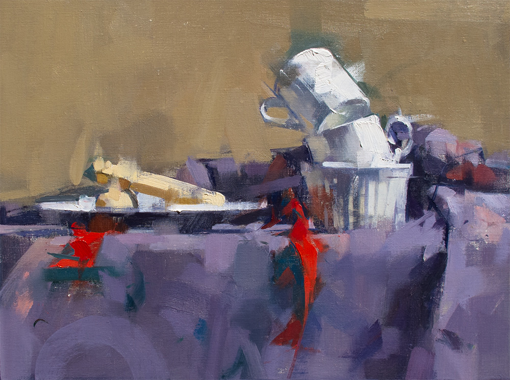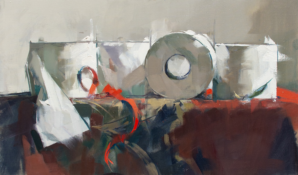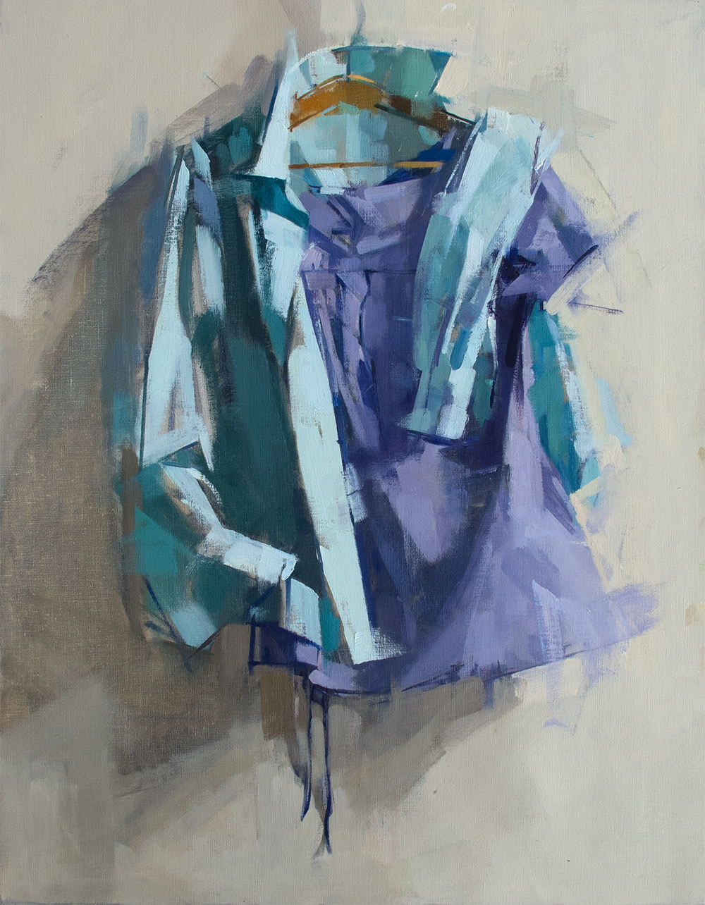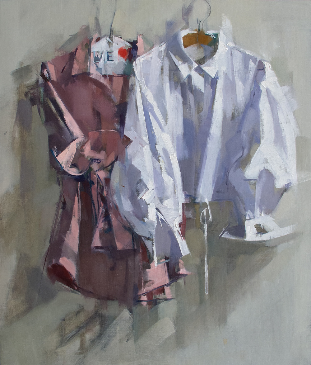 “What memories are carried by a tossed off article of clothing? By the detritus of the table? Why paint a shirt on a hanger? Rolls of toilet paper? Melon rinds on a cracked plate? Why paint from life at all? My paintings are not story telling in any narrative sense of the word, but the truer to life they are, the more convincingly they create the experience of having existed, and then the more they incite our human nature which wants to make stories of everything. A shirt freshly pressed is flat and neutral. But a shirt that has been worn, disturbed with folds, wrinkled by a human body who has moved, behaved and sweated, a shirt that has been worn and worn down and then insouciantly thrown on the hanger; that shirt contains the seeds of a narrative I will discover through the investigative and thrashing process of painting. I am very taken by the objects of daily life after they have been used. It’s there where we can see life passing; the remains of something that has happened. And that is what a painting is to me. It is something that has happened. I’ve painted figures all my life, portraitly confronting the direct gaze or voyeuristically looking over a shoulder, but I find that painting the objects, the stuff that figures have held, worn or used, offers a subtle poignancy and is suggestive of deeper interpretations.“