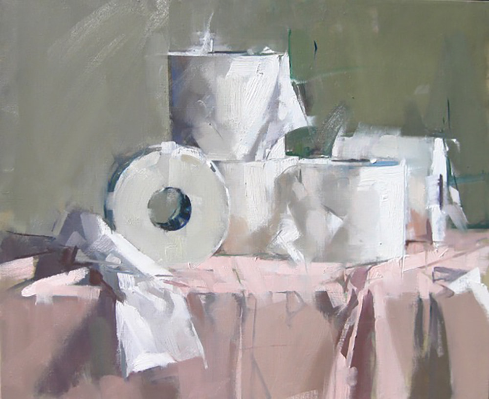 "Come impariamo studiando la fisica ottica, il bianco contiene tutti i colori. È anche il colore più reattivo, che riflette tutto ciò che lo circonda. Ma poiché tutti i colori che vediamo sono solo un fenomeno della nostra visione - non qualcosa del mondo 'oggettivo' - e i nostri occhi si adattano costantemente al mondo dei colori che abbiamo davanti a noi, ciò rende il bianco un problema assai difficile per il pittore. Le sue sottigliezze cromatiche sono quasi troppo sottili per essere percepite; essere in grado di discriminare i cambiamenti di colore a un livello così leggero e sfumato è decisamente entusiasmante! Ogni volta che scopro un nuovo oggetto bianco me ne reinnamoro completamente. La 'corsa alla carta igienica' all'inizio della pandemia di Covid è stato un momento curioso. Esteticamente, tutto quel bianco ben impilato, la geometria quasi perfetta di quei cilindri bianchi e morbidi - quadrati nei contorni ma rotondi nella forma - ha portato lo spirito di Piero della Francesca nella mia natura morta del XXI secolo. Quegli oggetti della vita quotidiana, senza pretese e del tutto trascurati, si sono improvvisamente trovati al centro della scena. Contenevano il peso del simbolo con un po' di umorismo".