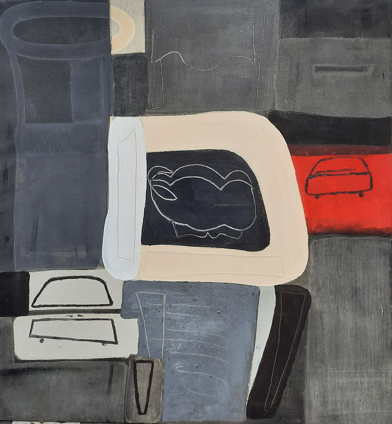 Spesso le forme si accavallano in un equilibrio precario, come in Viaggio (2020) e in Comò (2020), e così i contorni si intrecciano dando vita a nuove forme e a un’idea di stratificazione, dallo strato impalpabile, così come è quella dei nostri ricordi nella memoria.