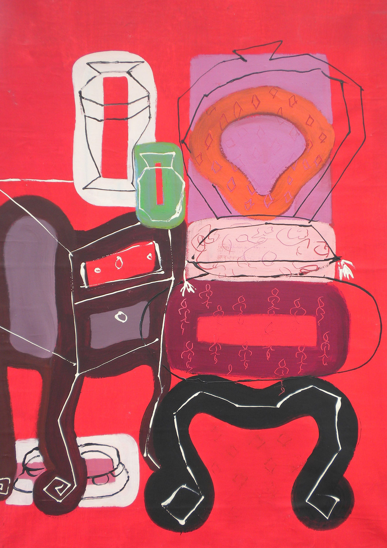 In Coppia in rosso (2008) le immagini di un comodino e di una poltrona, ricavate su di un fondo rosso, sono risolte visivamente in una sintesi grafica e si pongono come due presenze che alludono a due “figure” colte in un interno domestico, in una stretta relazione quotidiana.