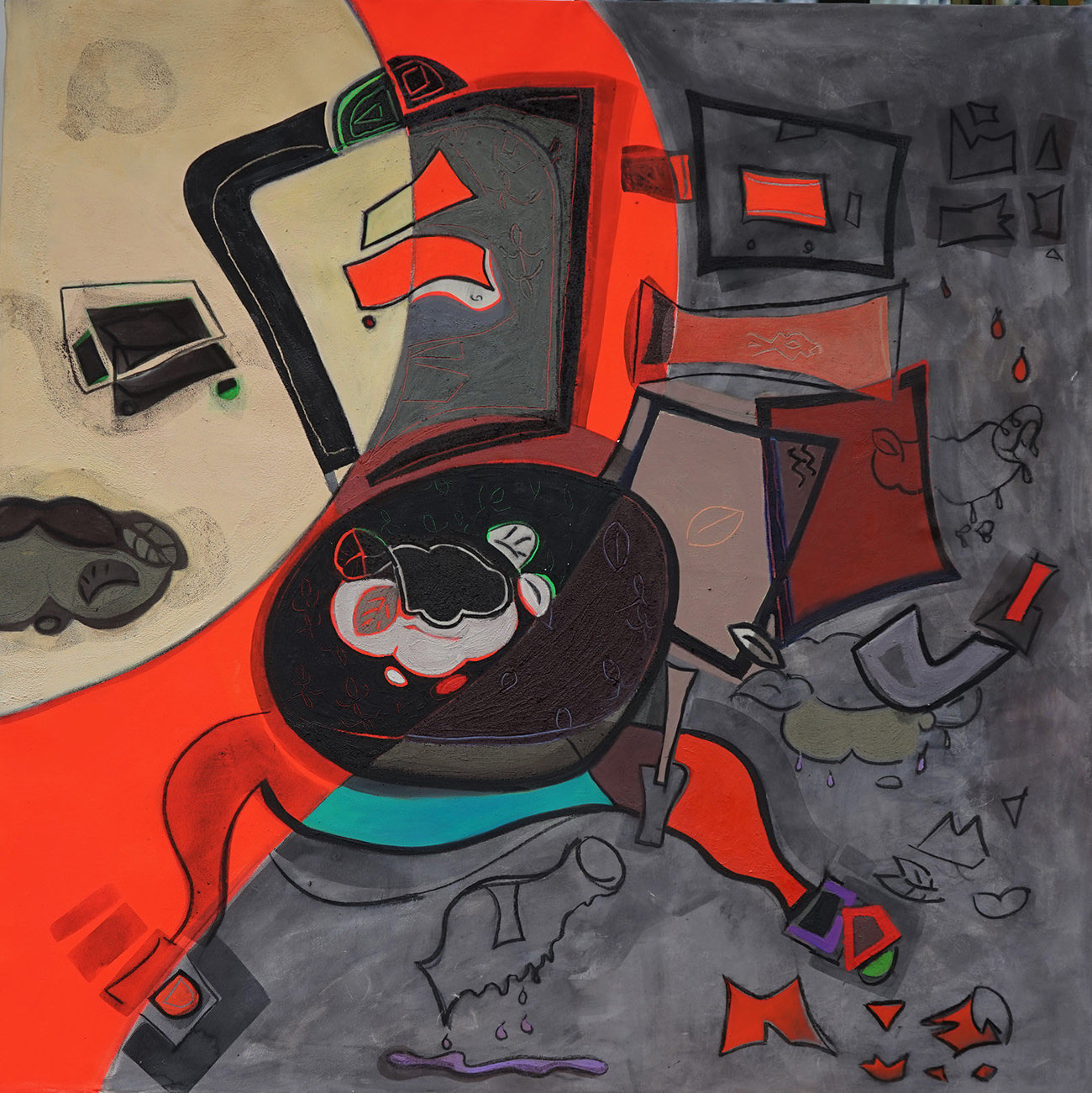 Sembrano soggette ad una vorticosa forza centrifuga le forme di Campo di battaglia (2021) che dal centro si espandono nello spazio, allontanandosi dalla lotta intrapresa.