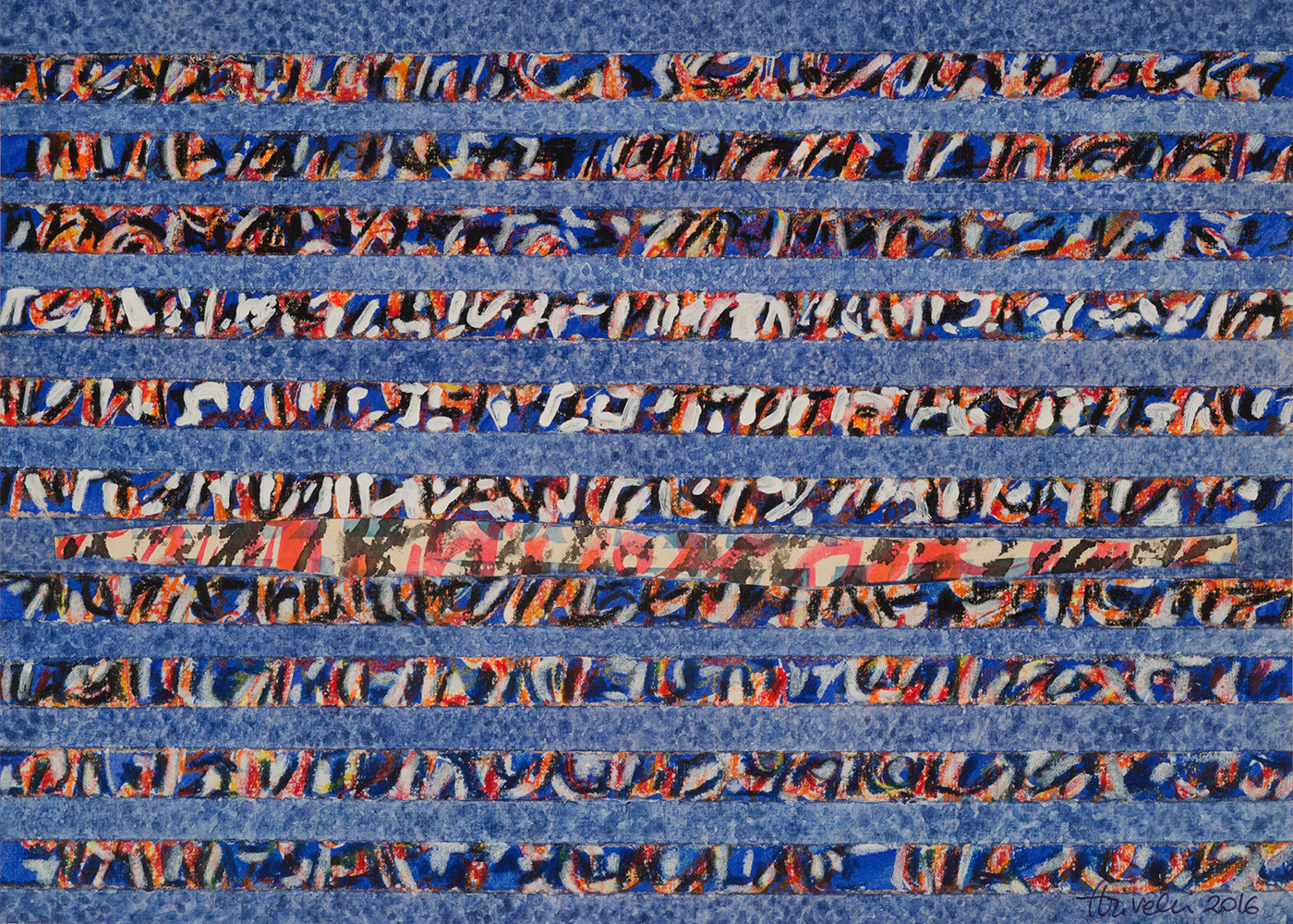 In Clessidra (2016) l'artista evoca l'inesorabile scorrere del tempo, a cui allude il titolo dell'opera, attraverso segni cangianti, "parole deformate" che dall'alto precipitano verso il basso passando dietro una forma azzurra che non riesce a trattenerli.