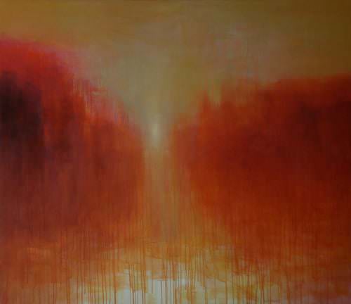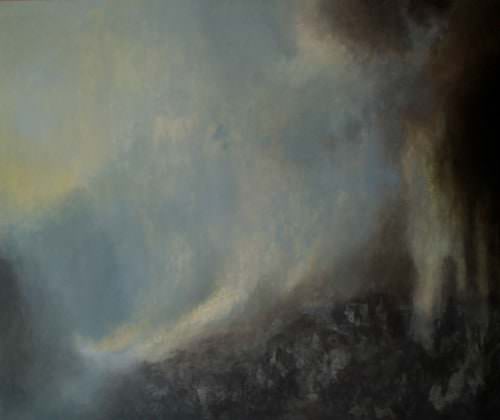 Riconducono, chissà fino a che punto inconsapevoli, agli inizi. Quei paesaggi tonali, atmosferici, da subito turneriani per affinità di timbro. Movimenti primi della sua ricerca. Ostinata, vibratile. Dinamica intesa con il pigmento che si fa colore, poi rarefà e sfida l’aria incontrando la luce. Scavo per dire questo incontro. Distolto dalla figurazione per attraversarla e ritrovarla volume. Nei corpi solidi di certe sue architetture dipinte, nei ghiacciai che affiorano da ere imprecisate, nell’inevitabile del richiamo alla natura. Così le vorticose ascese delle sue scale, i volti che colmano lo spazio reclini, ad occhi chiusi, il ciclo delle cere.