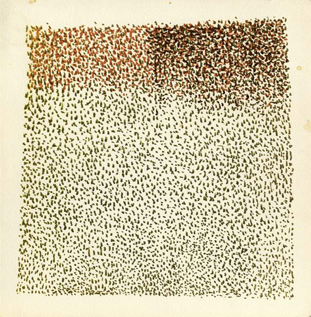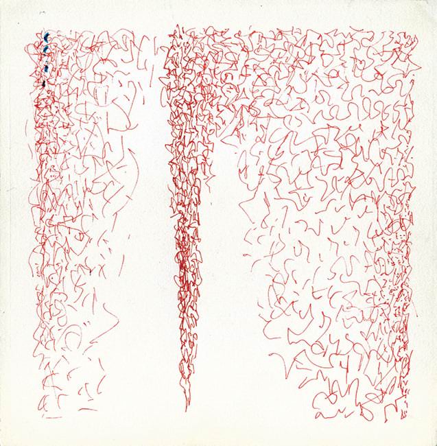I segni accumulandosi, distribuendosi sulla superficie del foglio si fanno struttura portante del disegno. Ogni segno ha un suo destino, una sua storia, ha un suo preciso valore formale e cromatico.