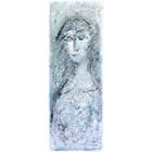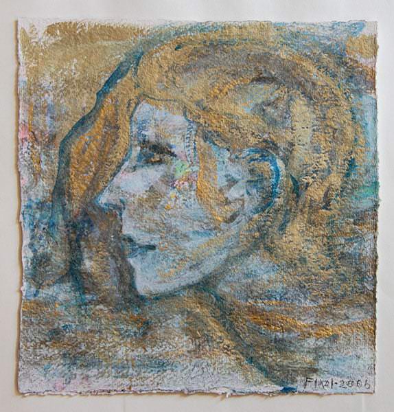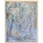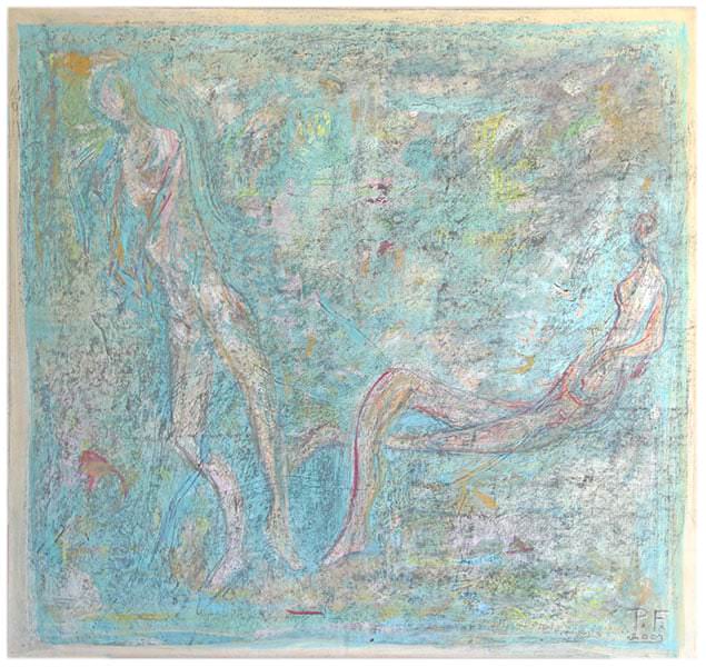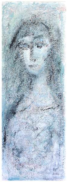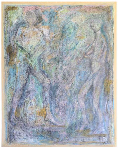 Tra le opere recenti presentate vi sono coppie "primigenie", figure dai corpi longilinei, colte in una dimensione idilliaca, mentre dialogano silenziosamente in una atmosfera vibrante dalle delicate tonalità azzurre e viola. Così muto risulta anche il volto "sacro" rappresentato con gli occhi chiusi in un clipeo dorato, che annulla ogni riferimento spaziale e temporale. Tra sperimentazioni e conferme continua incessante l'attività di Peggy.