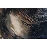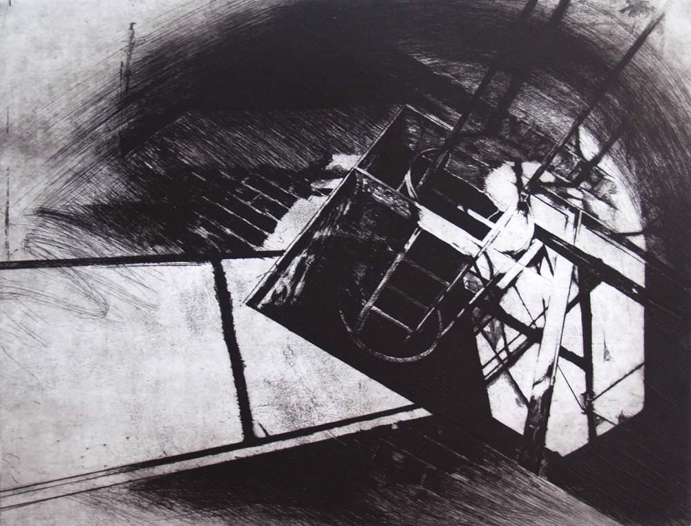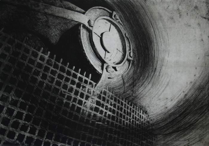 Nei suoi quadri – grandi o piccoli come i finestrini quadrati e senza affaccio di un cavedio – e nelle incisioni ciò non accade però sotto gli occhi di chi guarda, non ancora; vi è rappresentato un forte presagio di quel che potrà succedere tra poco agli utensili e ai luoghi covati dallo sguardo tiepido del pittore. La luce che entra dai vetri rotti e opachi è pur sempre luce che si fa strada tra l’abbandono; sfiora le cerniere ossidate e si posa sui banconi intorpiditi, sui torni e sui mandrini, sugli attrezzi, sui bidoni abbandonati di vernici. Riuscirà a rianimarli.