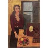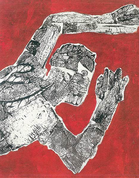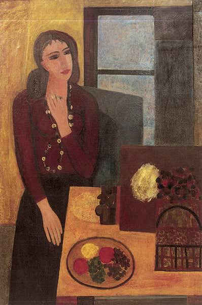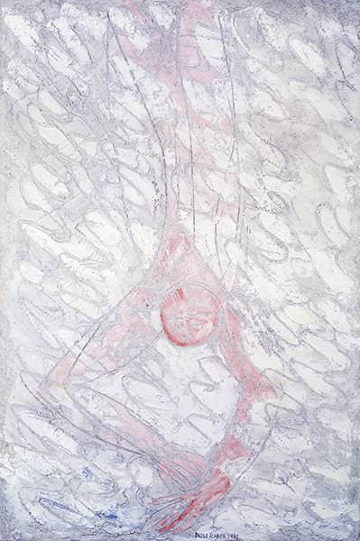 Alla pratica dell’affresco egli giungerà non a caso, ma per una scelta che lo doveva di fatto portare a frequentare la scuola di Saetti, imparando i metodi dello strappo e del trasporto dell’affresco su tela, ma anche affrancandosi ben presto dalla sua inevitabile influenza, come si evince osservando un’opera che rivestirà un ruolo determinante per i suoi svolgimenti, la grande Figura del ’58, virando così la sua ricerca a configurare una situazione d’ambiente, a cogliere l’insieme, donna e cose, in una serrata dinamica sia formale che emotiva. Subito dopo l’artista si avventurerà a sperimentare contenuti più simbolici, declinando ancestrali visionarietà, da cui trae immagini spaesanti, angeliche figure volanti, immensi raggianti girasoli, enigmatici volti femminili, sguardi attoniti portatori di inquietanti misteri esistenziali e di trascendenze spirituali. Una svolta radicale che però era felicemente prospettata sin dai cicli pittorici da lui eseguiti dal 1964 al ’66, appartenenti a una sua originale “maniera nera”, con i quali si chiude la fervida stagione di quegli anni, tra tensioni fantastiche e allucinatorie vivezze.